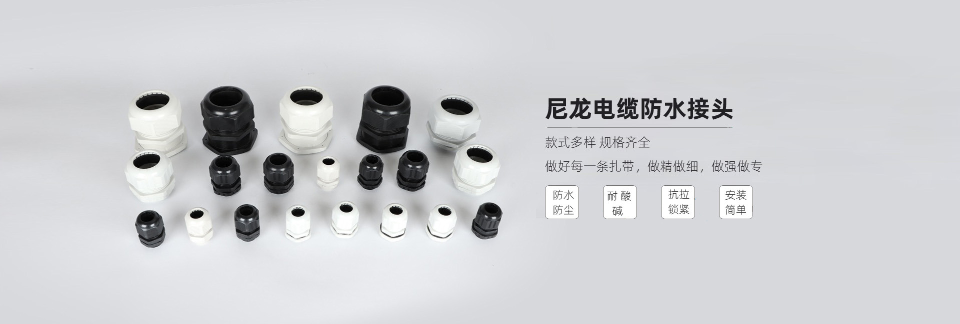 尼龍材質適用惡劣環境 紅、灰、黑、深灰、白、藍 六種顏色 常規:黑、灰兩種顏色,其它顏色需要定做 在嚴寒與高溫等惡劣環境下,保持長期不開裂不漏水 高密封性防水接頭保護電纜安全,長期使用不容易滲水